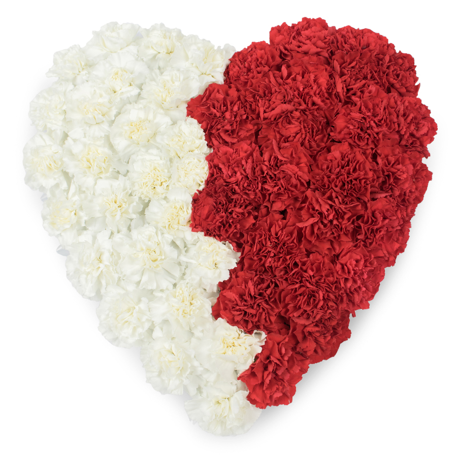 Our heart-shaped carnation bouquet is a symbol of love and sympathy, featuring a vibrant mix of white and red carnations. Each flower is hand-selected to ensure the highest quality and freshness.